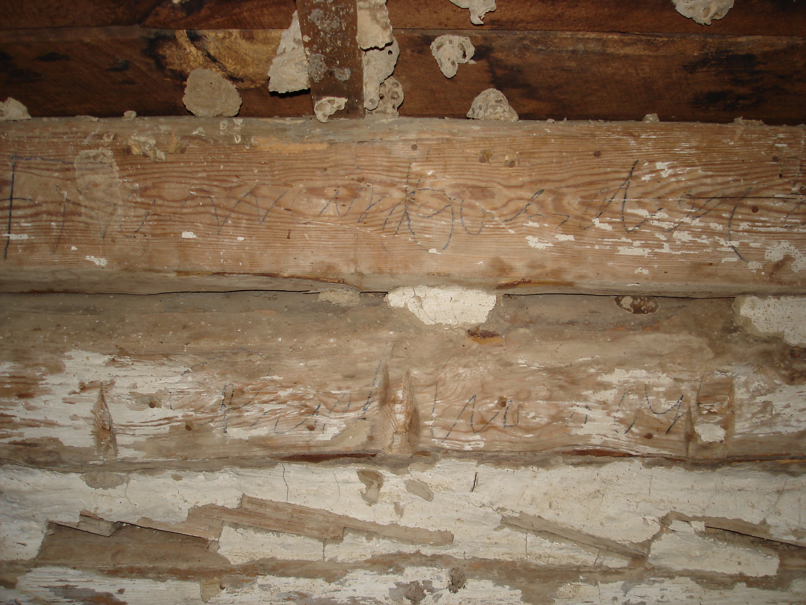 The photo itself is of the inside of the old house at the farm.  The log has writing on it that appears to say “Francis Cordia” on the top log.  I’m not sure what the writing on the 2nd log says.